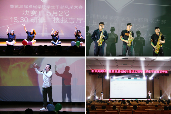 此次比赛历时1个月,机械与储运工程学院本科生、研究生180余名学生干部参加,比赛分别以笔试与PPT展示形式进行初试与复试,最终角逐处11名学生干部参加决赛。决赛分为展我本色(自我介绍VCR播放以及才艺展示)、一站到底(答题淘汰)、我是影帝(角色扮演)与针锋相对(三分钟演讲以及对有关辩题进行辩论)四部分,期间,还有艺术团管乐团和中国政法大学CG街舞团的精彩表演。