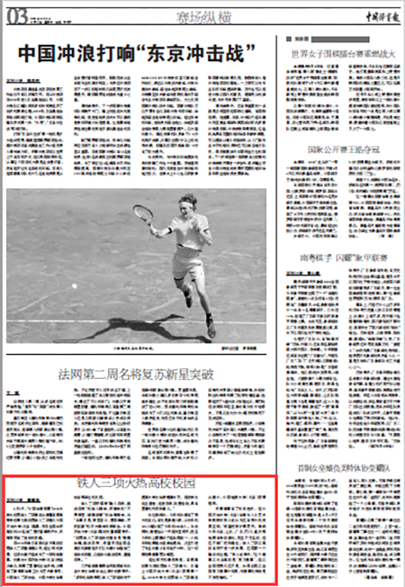 6月5日出版的《中国体育报》第3版以“铁人三项火热高校校园”为题对大赛进行了报道