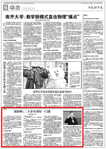《中国科学报》第6版以“郭绍辉:二十余年讲好一门课”为题报道了开云kaiyun教师风采