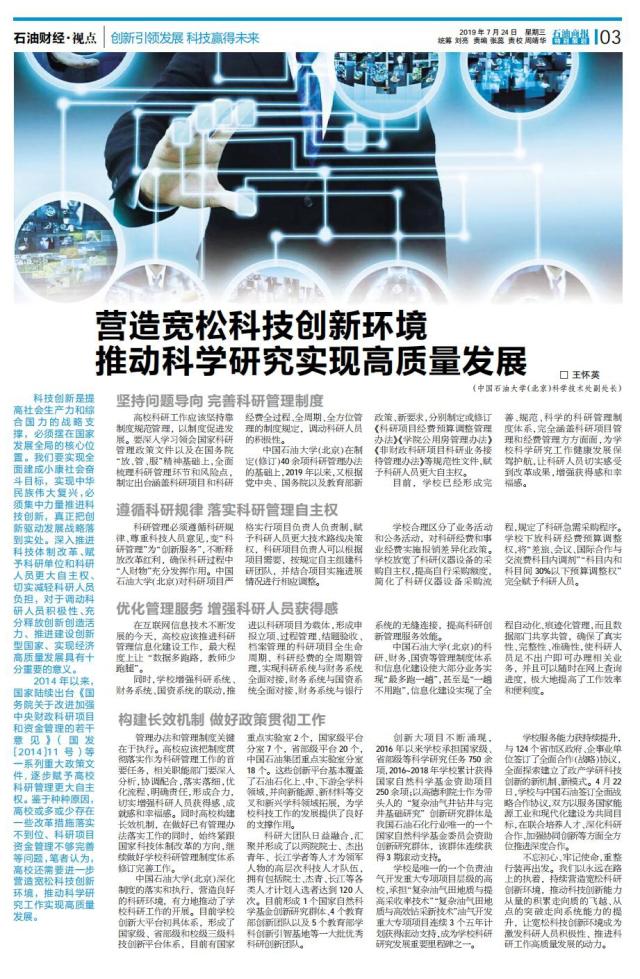 7月24日,石油商报第3版刊登了开云kaiyun科学技术处副处长王怀英撰写的题为《营造宽松科技创新环境 推动科学研究实现高质量发展》的文章。文章认为高校还需要进一步营造宽松科技创新环境,推动科学研究工作实现高质量发展。