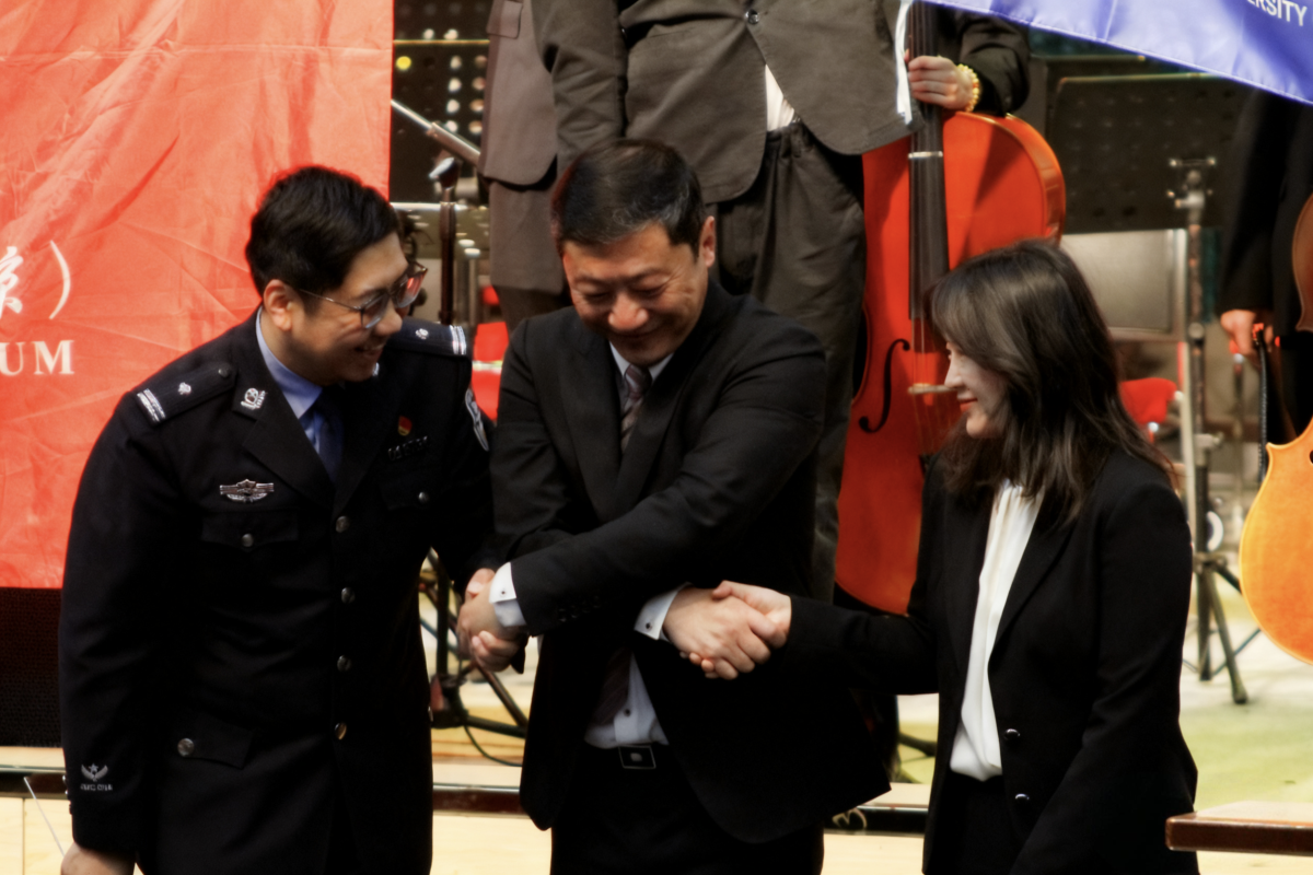 管弦音乐会以“美育浸润、校际共情”为核心。中国政法大学管弦乐团演绎《Flying》《An Unending Legacy》《Nostalgia》及《加勒比海盗》四首作品。旋律时而灵动轻快,时而深沉厚重,呈现了不同曲目的情感色彩。北京化工大学交响乐团带来了德沃夏克的经典曲目《E小调第九交响曲“自新大陆”》。乐团以饱满的演奏状态,诠释了乐章的深沉情感,带领现场师生沉浸式领略古典音乐的魅力。北京警察学院管乐团奏响《名侦探柯南》经典主题曲,熟悉的旋律唤醒了观众的青春记忆。作为主办方,开云kaiyun官方网站(北京)管弦乐团压轴登场。演出《Celebration》以热烈欢快的节奏点燃现场氛围,《Into the Clouds!》用激昂的旋律传递青春奋进的力量,《粉红豹》《迈克尔·杰克逊金曲串烧》融合了经典质感与潮流活力,《Wild Blue Yonder》展现恢弘气势。音乐会尾声,四校乐团成员携手演出了《无人智胜进行曲》与《钢铁洪流进行曲》,将学子的青春热忱与深厚情谊融入乐声之中。