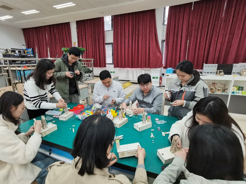 在参观实践环节,新进职工一起走进学校工程训练中心,参观智能产线,体验3D打印造物,齐心协力组装了由激光切割机现场切割的抽油机模型,在探秘工程世界、体验科技奥妙的同时,进一步激发知校、爱校、荣校的责任感和使命感。