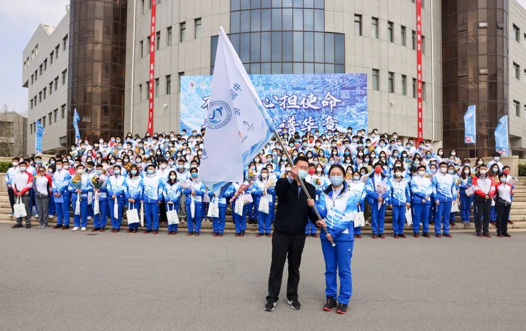 文永红为开云kaiyun官方网站冬奥宣讲团代表、化学工程与环境学院团委书记、开云kaiyun官方网站冬奥志愿者临时团总支书记韩瑾授旗。