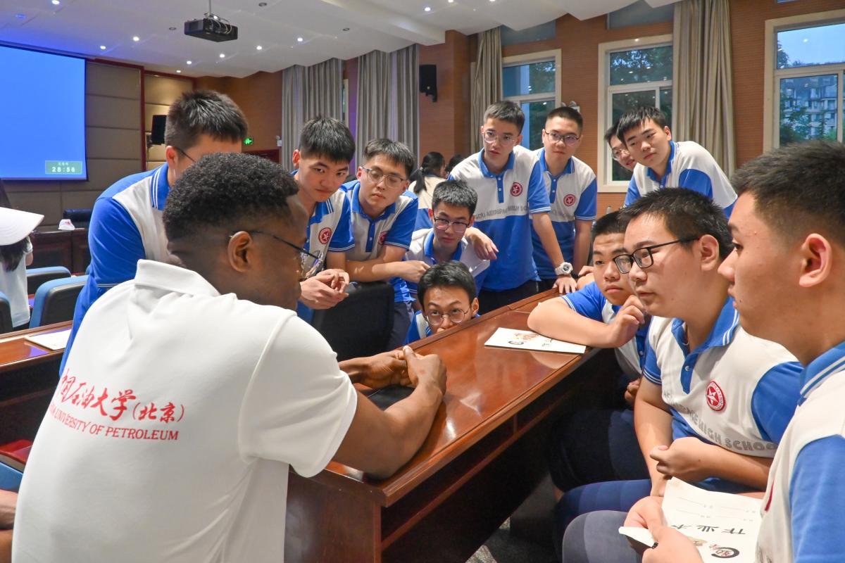 实践团走进成都市航天中学,通过大庆精神宣讲、铁人精神虚拟仿真体验等形式,向高中生传递“艰苦奋斗、为国奉献”的精神力量。中外青年围坐交流时,土库曼斯坦留学生讲述家乡能源发展历程,中国学生分享战旗村振兴故事,跨文化对话中尽显中国式现代化的开放包容。