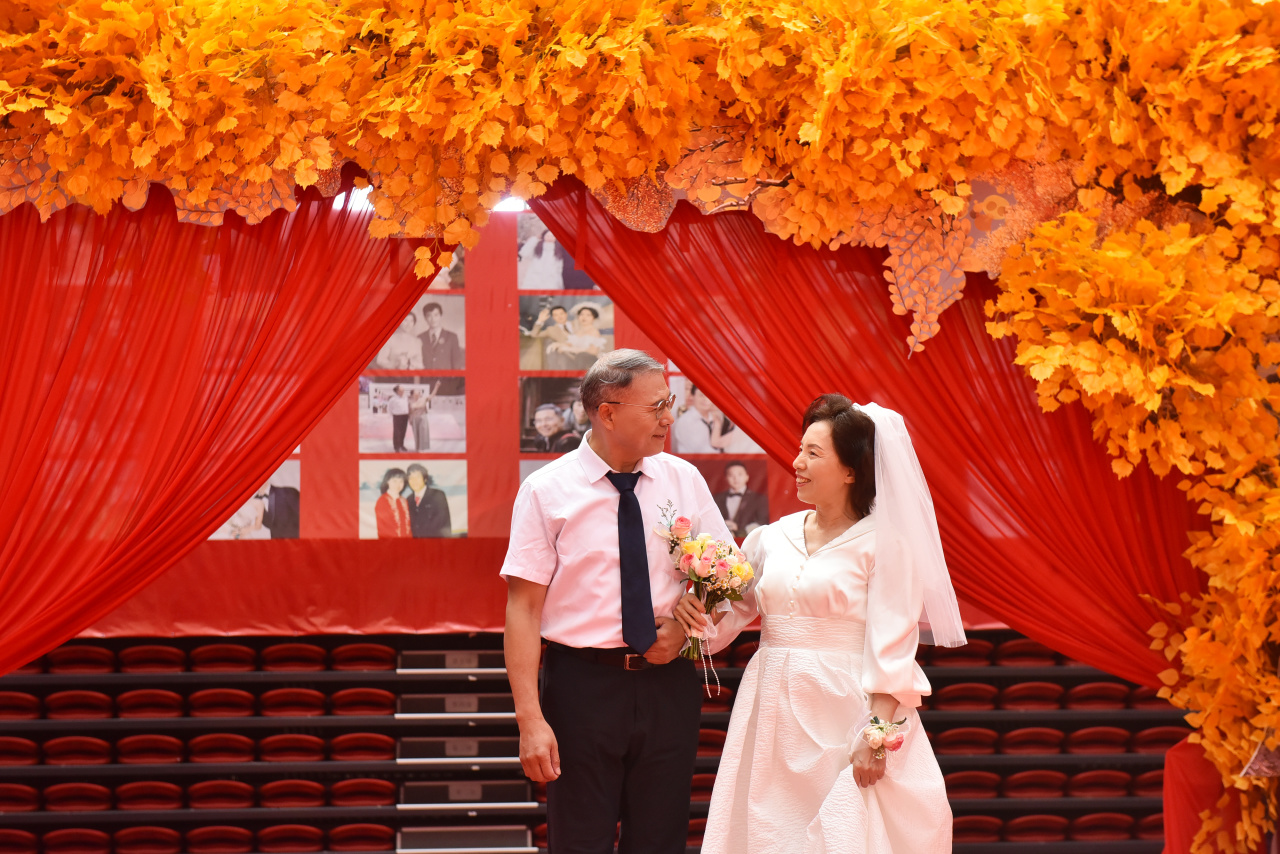 上午11点58分,体育馆鲜花簇拥,《青春舞曲》轻盈美妙,处处洋溢着幸福气息。55对新人在掌声和祝福中执手走上红毯,穿过拱门,款款步入典礼主会场。