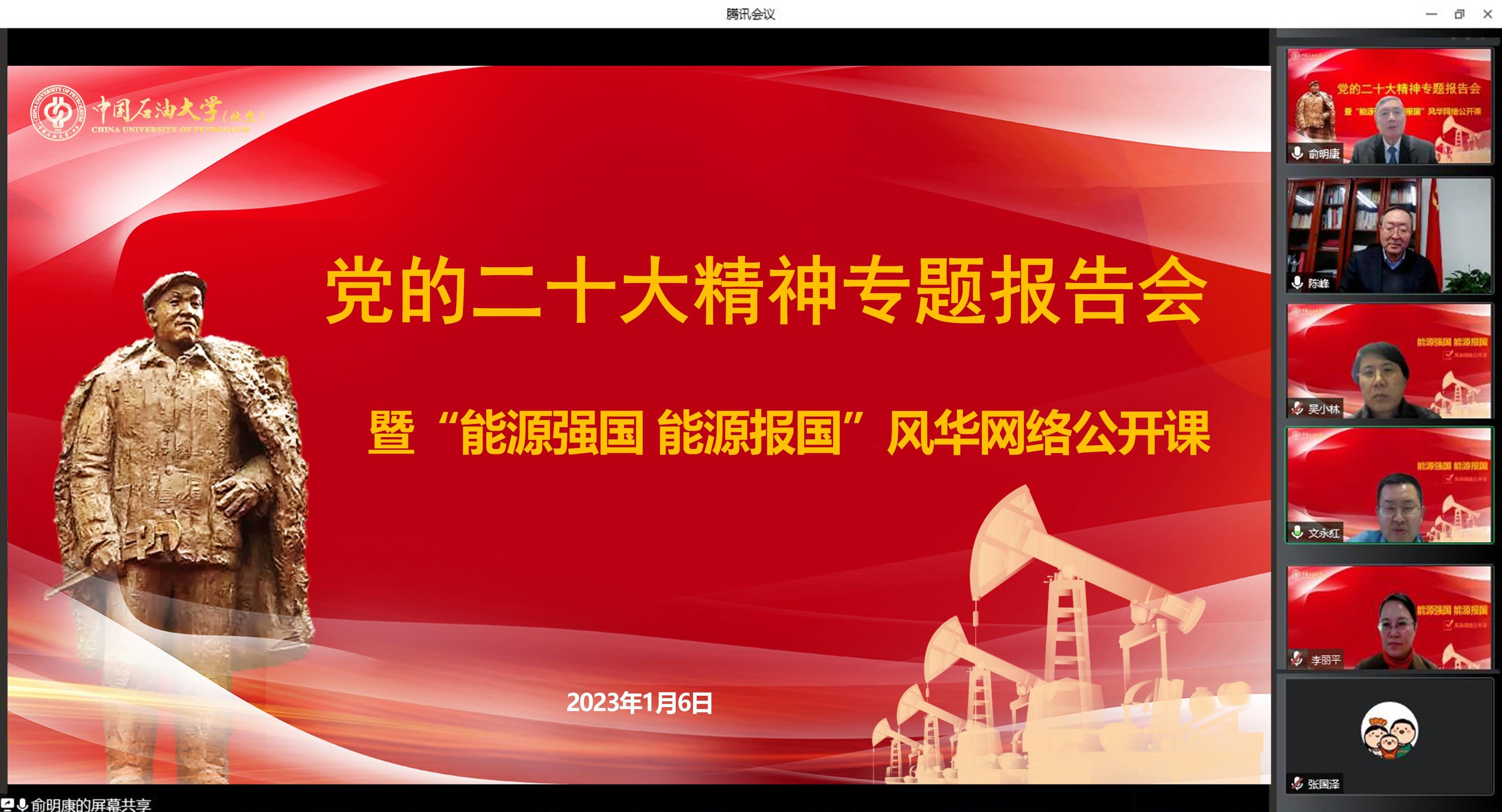 为深入学习贯彻党的二十大精神,传承弘扬中国共产党人精神谱系,1月6日下午,开云kaiyun官方网站举办学习贯彻党的二十大精神专题报告会暨“能源强国 能源报国”风华网络公开课,中国石化原思想政治工作部副主任俞明康受邀作了题为“石油战线始终是共和国改革发展的一面旗帜,要继续举好这面旗帜——贯彻党的二十大精神,弘扬大庆精神铁人精神”的专题报告。