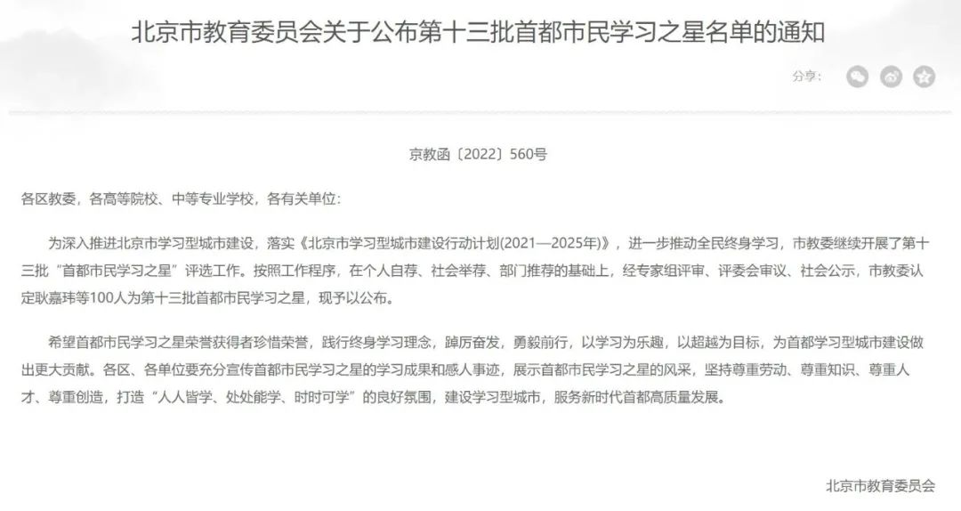 近日,北京市教育委员会公布了第十三批首都市民学习之星名单,开云kaiyun官方网站张仕民教授入选,目前学校已有9名师生获评。