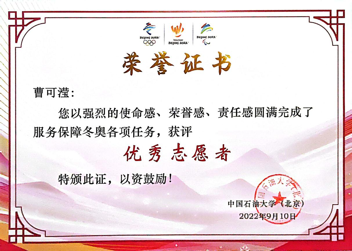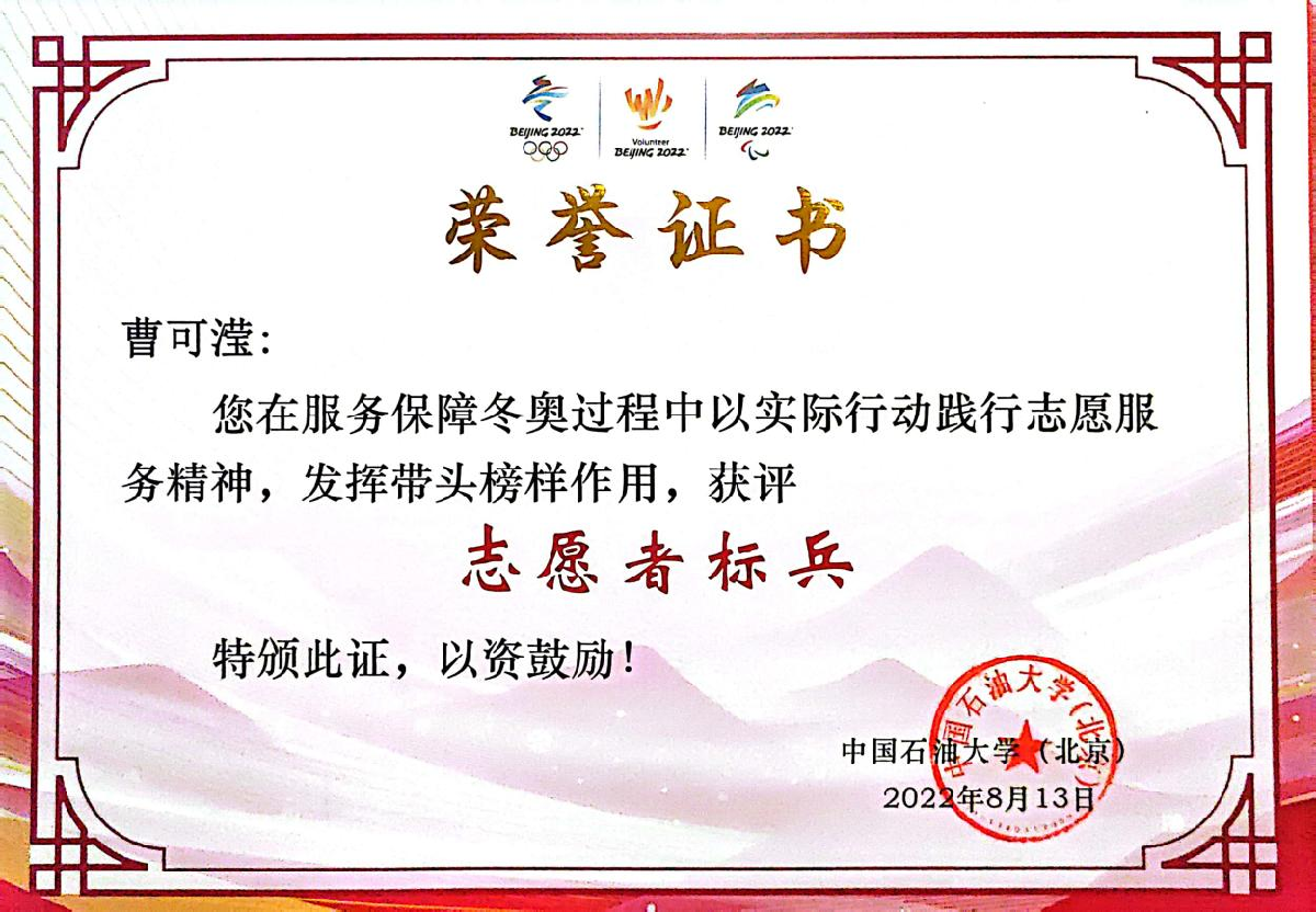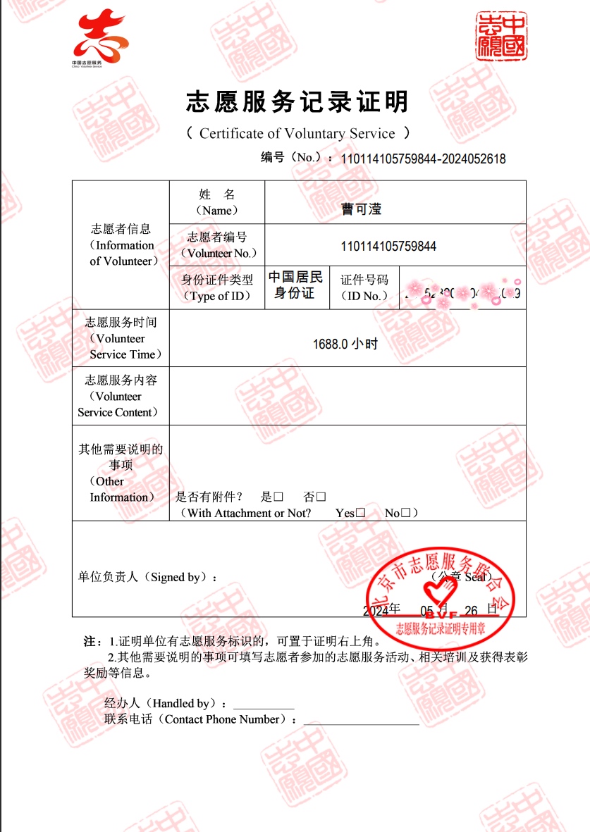 大学四年,曹可滢参与了民生、教育、生态等10余个领域的志愿服务,服务范围覆盖全国8个省市,志愿总时长达1688小时。她曾参与中国国际服务贸易交易会、中关村论坛、2023北京半程马拉松等大型活动志愿服务,也曾常态化地服务于敬老爱老、绿色环保等领域。她的身影总在最需要的地方闪耀。