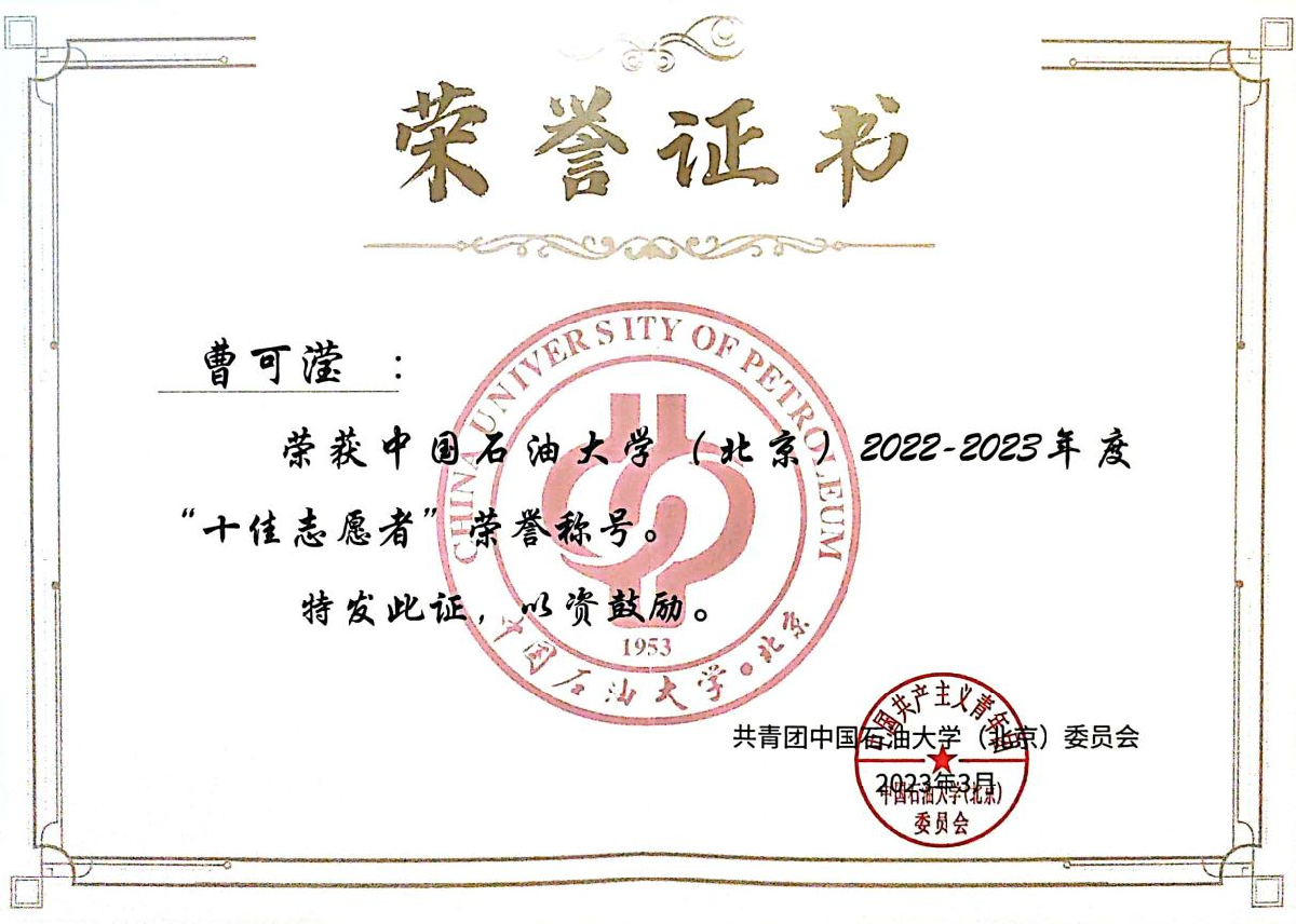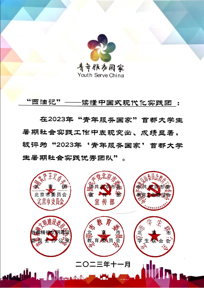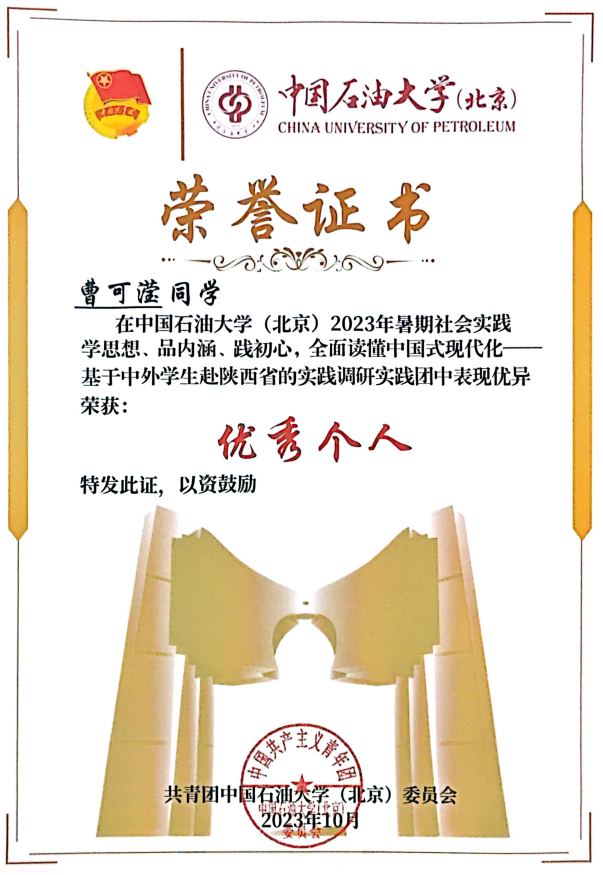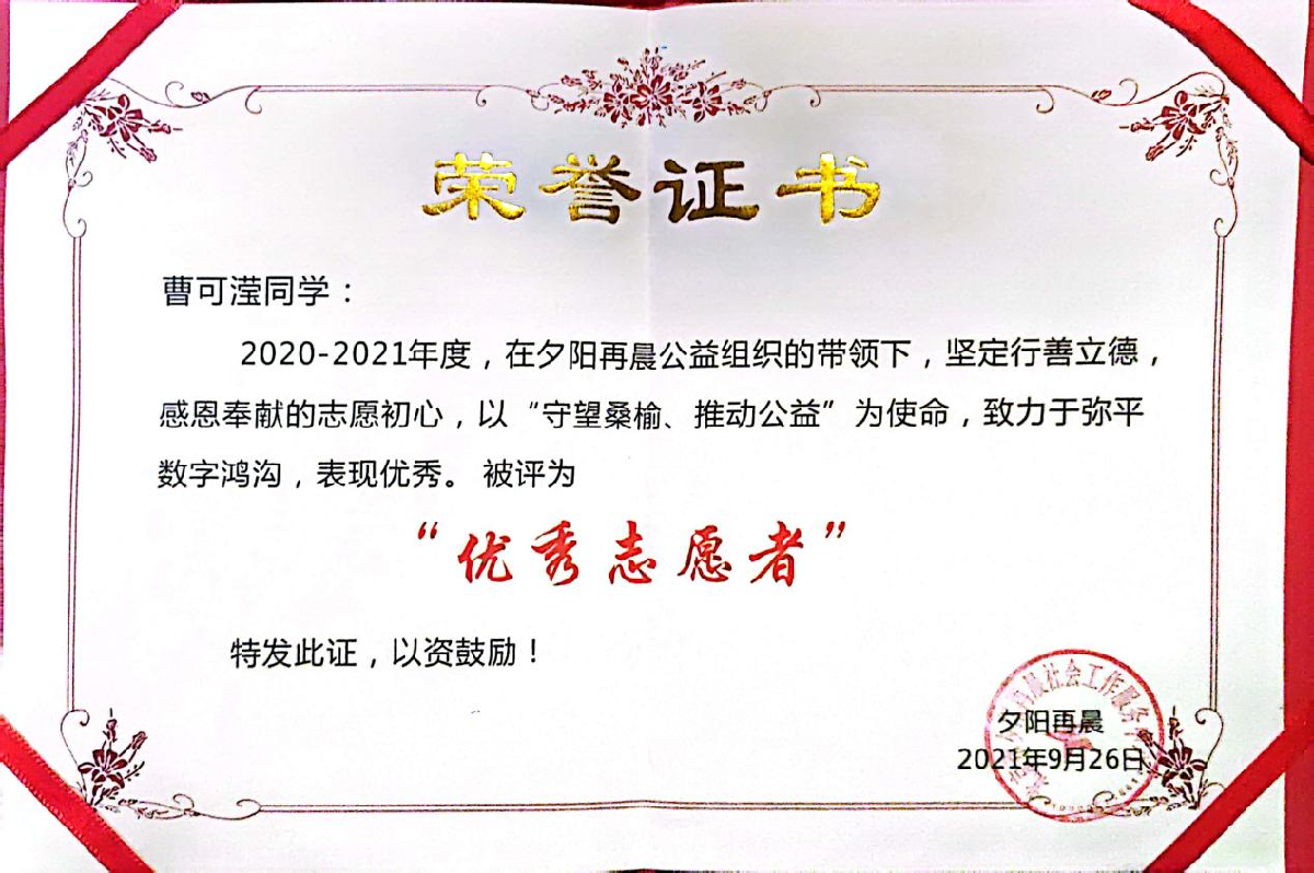 曹可滢所在的团队连续三次荣获全国支教荣誉,她个人亦两度被评为“一起云支教”的突出贡献高校志愿者领队,跻身首都高校仅四名获此荣誉者之列。