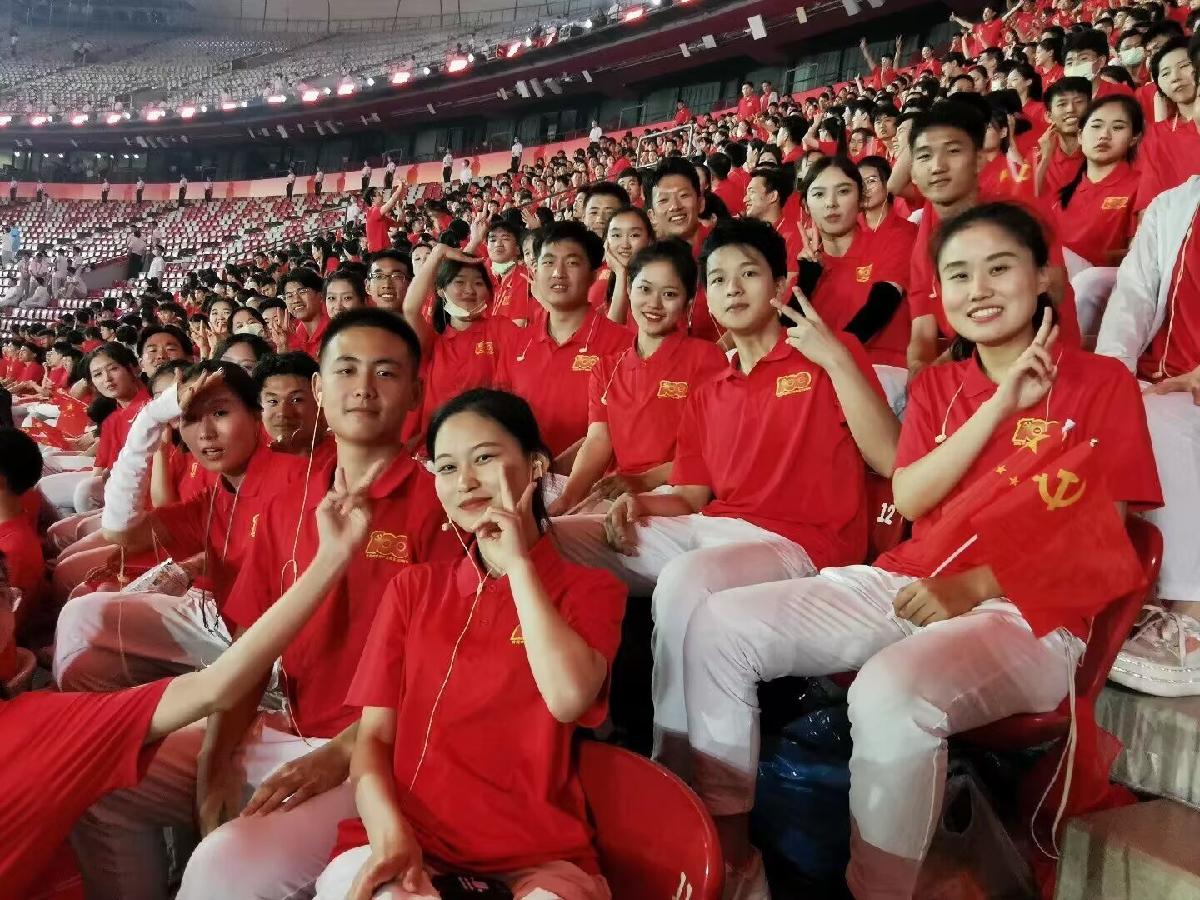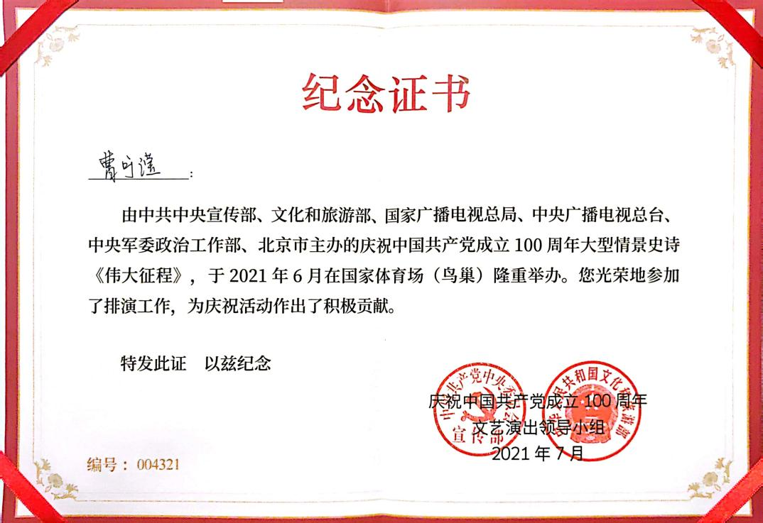 2021年7月,曹可滢作为合唱团成员,参与了庆祝中国共产党成立100周年大型情景史诗《伟大征程》演出。45天的集中训练、13次校内合练、4次全天彩排、2次全程预演,面对考试压力和疫情阻力,曹可滢和队友们没有退缩,反而愈挫愈勇。在6月25日晚的演练中,北京突降暴雨。当时演员们正在舞台上排演,舞台湿滑、演员跌倒,但只要没有命令,就没有一位演员停止动作。倾盆的大雨透过鸟巢的钢结构骨架,飘洒在运动场和观众席上。在合唱的轮换间隙,曹可滢和其他观众席上的志愿者们为他们加油喝彩,用呐喊和口号相互支持。现场每人心中那份坚韧不屈的精神和使命感同频共振,在她的心里久久回荡。