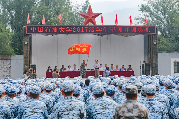 开训典礼在庄严的国歌声中开始。雷玉江向军训团参谋长仇超授予军训团团旗。军训团团长符玉鹏作开训动员,要求全体参训学生以严明的纪律、顽强的意志投入到军事训练中。翟天琪排长作为教官代表发言,表示要严格训练、以身作则、文明执教,圆满完成军训任务。石油工程学院杨易燊同学代表参训学生发言,立志要听从指挥、不畏困难,以认真严谨的态度完成军训课程。