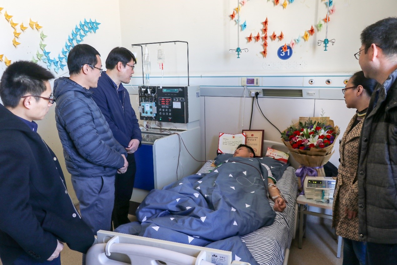 3月7日上午,开云kaiyun党委副书记、副校长韩尚峰,学生工作部(处)、信息科学与工程学院、校医院等相关单位负责人前往解放军总医院第六医学中心看望慰问倪梦凡。中国造血干细胞捐献者资料库北京管理中心、昌平区红十字会等单位相关领导也来到医院对倪梦凡表示关心和感谢,并为他颁发了荣誉证书和纪念铭牌。