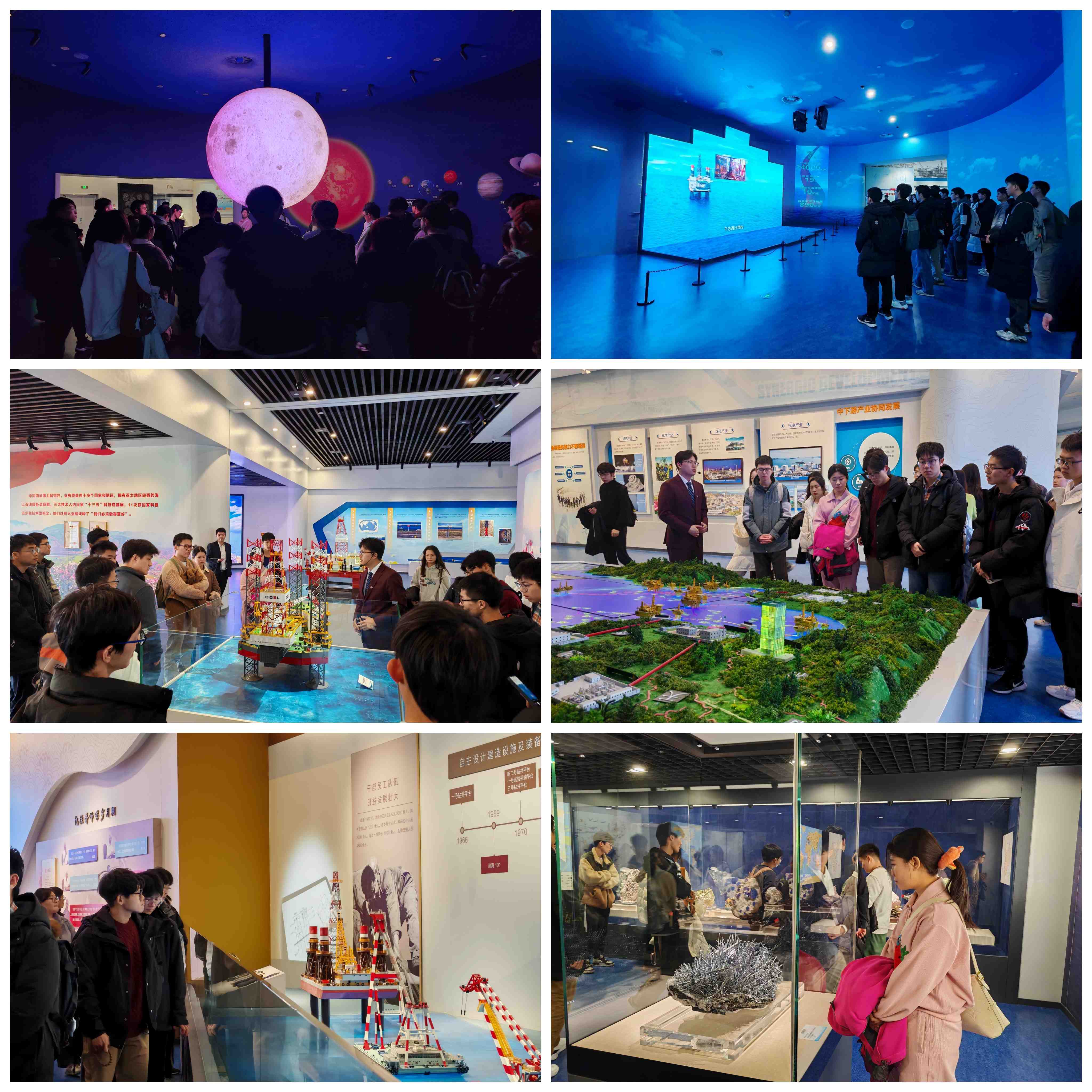 顺着时间的印记,同学们继续走近中国海洋石油工业七十年代“走出去学习,请进来合作”及九十年代 “与时俱进,革故鼎新”的发展历程。从艰苦奋斗到高速发展,同学们眼中的景仰也慢慢变换成了骄傲。第二个展厅为科普展厅,在这里同学们沉浸式体验了海洋资源、海上工程建设、工程装备能力、工程关键技术、工程建设基地等多个展示项目,切身体会了海洋油气资源勘探开发的智慧和创新的挑战。