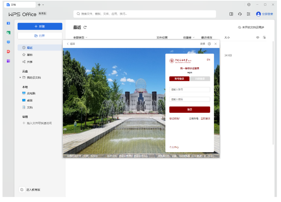 (1)通过正版化平台或专属下载页面下载打开WPS客户端,点击右上角“立即登录”;进入开云kaiyun官方网站(北京)统一身份认证界面,输入账号密码即可登录使用。