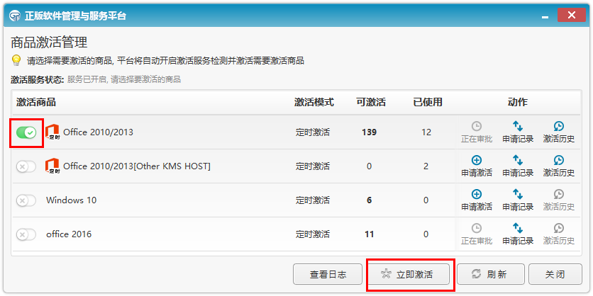 (5)登录成功后,软件自动弹出商品激活管理窗口(Windows和Office默认各分配10次激活次数)点击左边的选项按钮,勾选需要激活的产品,然后点击“立即激活”。