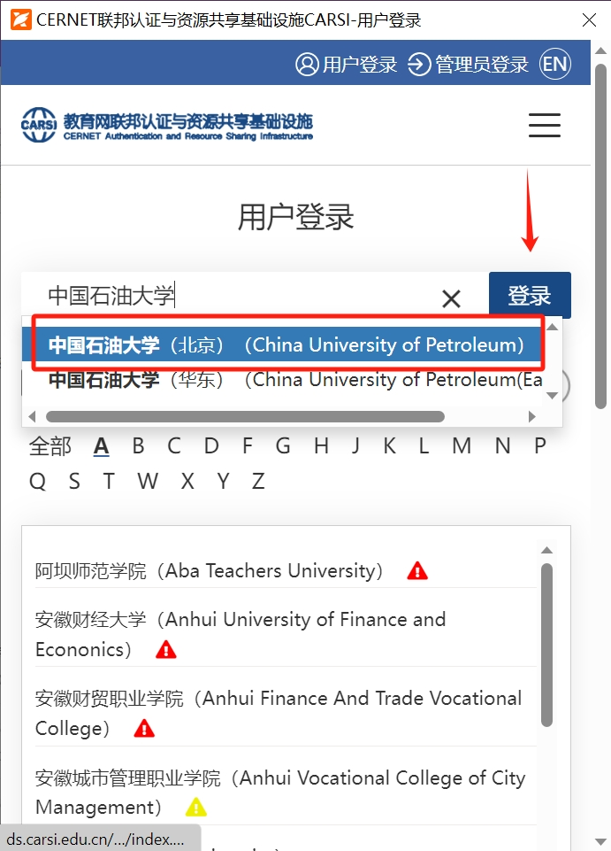 (3)选择完CARSI后,系统将自动跳转至CARSI登录页面,在方框中填入所在学校名称,点击“登录”按钮;(如遇到证书已过期提示,请点击继续登录即可)
