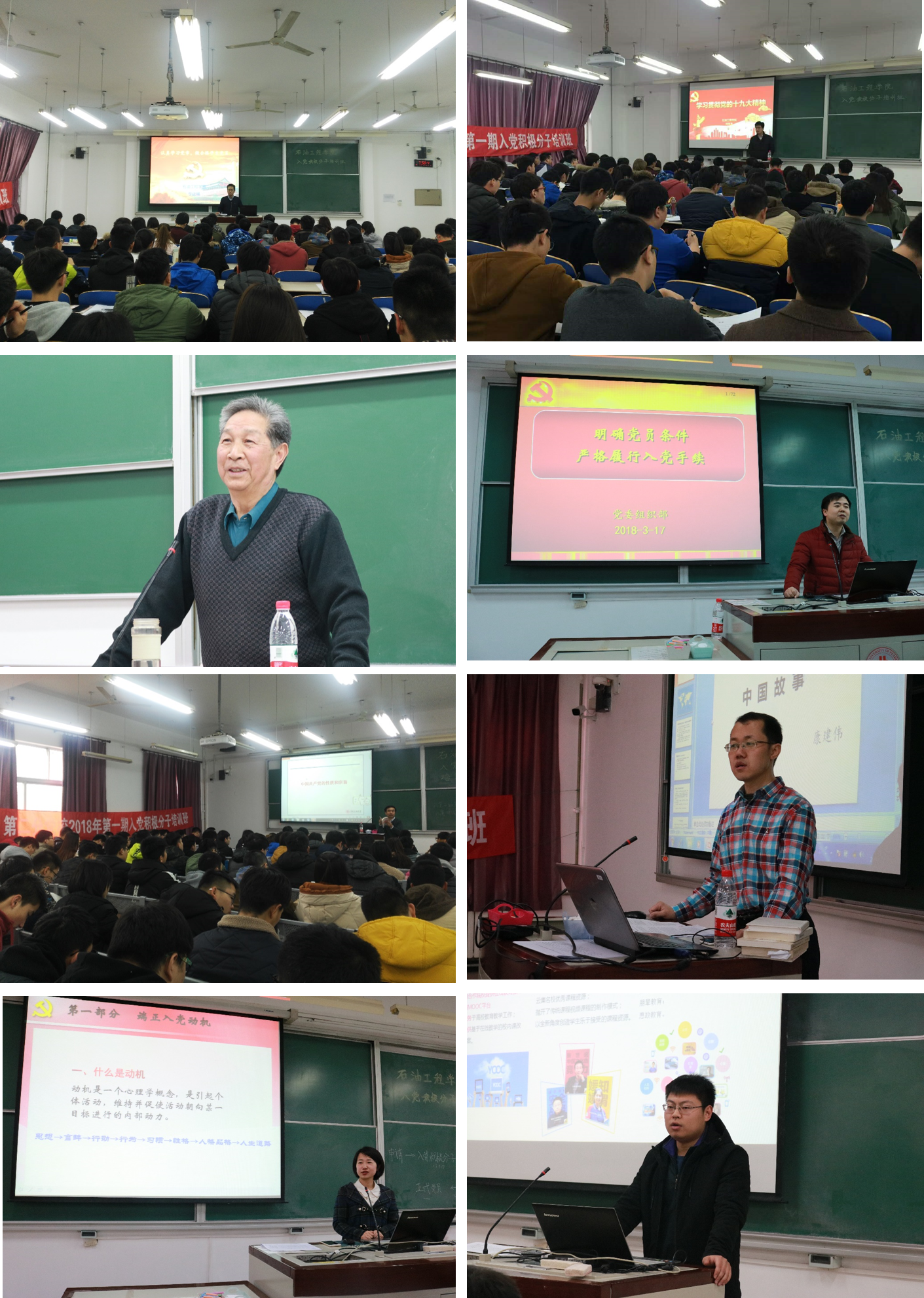 在3月17-18日的集中培训环节中,第二分党校邀请石油工程学院党委书记宁正福、石油工程学院党委副书记闫亮亮、组织部干事肖坤、离退休教师孙忠科、马克思主义学院教师曹培强、康建伟、石油工程学院党务秘书方百会、辅导员高热雨等众多优秀党务教育工作者为入党积极分子讲授党课。党课涵盖了从新党章学习辨析、十九大精神的解读、党的性质和宗旨的学习到入党动机的端正、入党目的和入党条件手续的明确、提高党性修养、中国故事等内容。通过集中培训环节对入党积极分子进行党的基础理论系统培训,通过志愿实践服务督促学员实践力行,发挥先锋模范作用,使学员系统学习掌握中国共产党的各项规章制度,进一步提高入党积极分子对党的认识,端正入党动机,坚定共产主义信念,牢固树立全心全意为人民服务的思想,按照党员的标准,严格要求自己。
