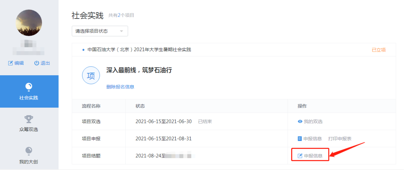 8月23日23:00前,实践成果包括实践总结、调研报告或论文、访谈记录、观察报告或工作报告、照片、视频等资料。所有实践团队按要求认真整理总结实践成果(具体要求见《附件1:实践成果收集说明》),由队长从电脑端登录https://sct.cup.edu.cn/,到个人中心项目结题-申报信息处填报。