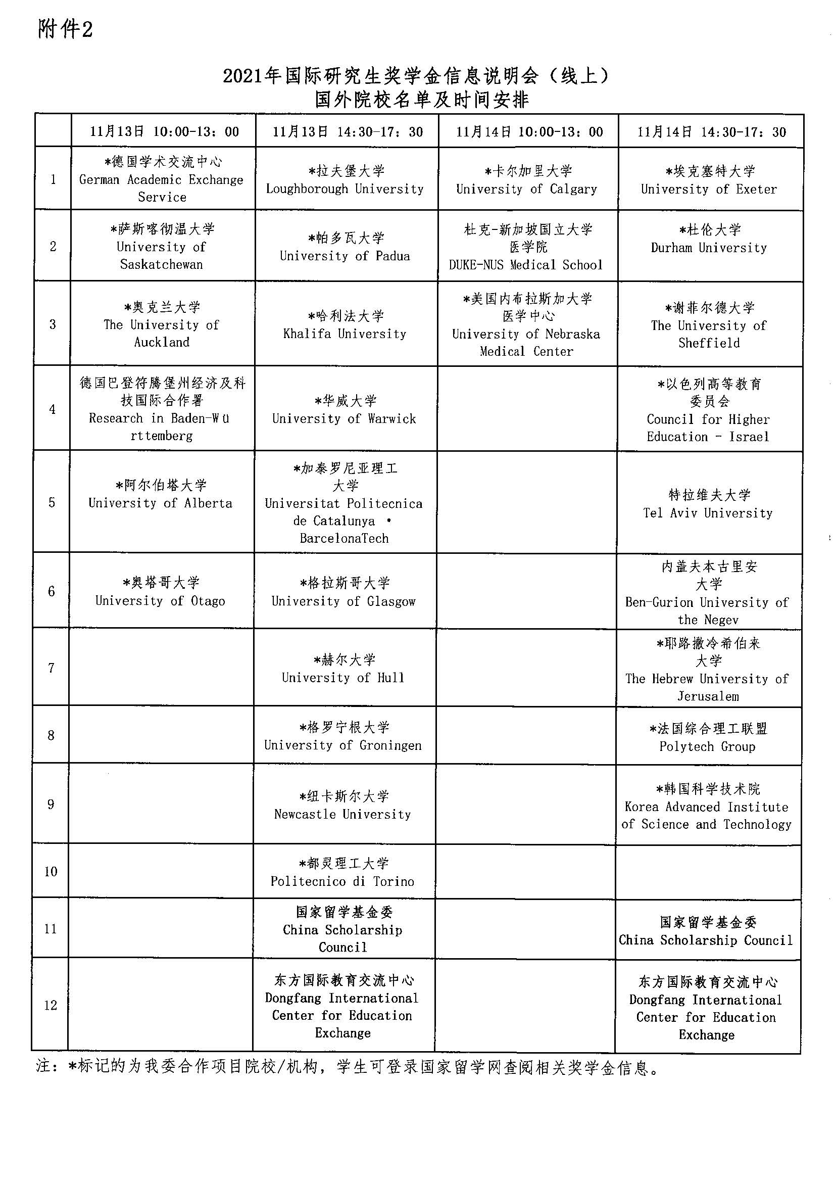 为促进国内外高水平大学交流合作,向同学们提供与国外知名大学面对面交流的机会,国家留学基金管理委员会计划于2021年11月13日-14日通过线上形式举办第十三届国际研究生奖学金信息说明会(IGSF)。会议内容包括:2022年国家公派出国留学政策解读及项目宣讲、2022年国外高校/科研机构留学资讯及招生信息讲座、国外高校/科研机构与国内学生一对一面试等部分。