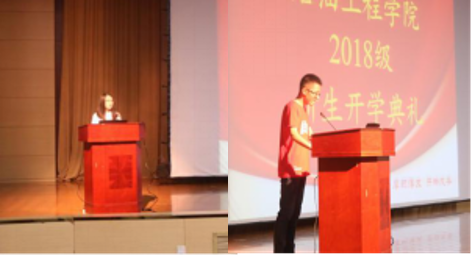 典礼在嘹亮的国歌声中开幕,随后,油气田开发工程2017级硕士研究生黄宁曼代表在校生发言。她结合自身学习经历,建议新生们把握好手中的方向盘,抓住一切未来的可能,敢于对未知的事物进行探索。接下来,石油工程2018级本科新生周成志作为新生代表发言,他表达了对学院的感谢和敬意,同时对自己提出四点要求,时刻约束自己。