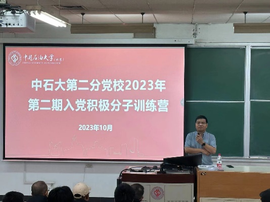 在10月14-15日的线下集中培训环节,第二分党校邀请石油工程学院党委书记黄世军、马克思主义学院党委书记刘韵秋、石油工程学院党委副书记刘东东、马克思主义学院教师李卫红、袁鹏、国若家等众多优秀党务教育工作者为入党积极分子讲授党课,分别以“发展党员工作案例”“《中国共产党章程(修正案)》解读”“认真贯彻党和国家宗教政策,坚决抵御和防范校园宗教渗透”“全面理解中国式现代化的科学内涵和本质要求”“第二个结合”的历史、现实与未来”“新时代大学生党员的责任与担当”“中国特色社会主义制度自信的历史逻辑”为题作了报告,同时部分入党积极分子线下参加了学校开班第一课。本次培训对启发入党积极分子思想政治觉悟,帮助他们明确并端正入党动机,切实提高政治理论素质具有重要作用。