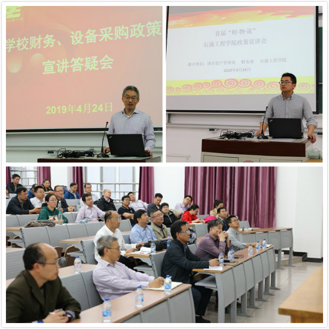 帮助学院教师了解财务、设备采购相关规定政策和相关管理要求,合理合规的使用科研经费,落实全面从严治党工作要求,4月24日下午,财务处处长郑仕敏、国资处处长陈义陆带队深入石油工程学院,召开学校财务、设备采购政策宣讲答疑活动。石油工程学院党政领导班子及学院全体教职工参加了专题政策宣讲会。会议由宁正福书记主持。