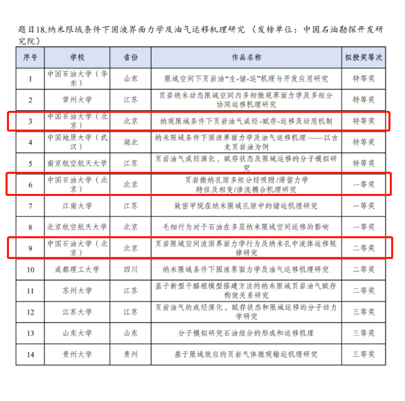 在 “揭榜挂帅”专项赛中获得全国特等奖1项(擂主)、全国一等奖1项、全国二等奖1项,在赛题18——纳米限域条件下固液界面力学及油气运移机理研究中获得全国最好成绩!