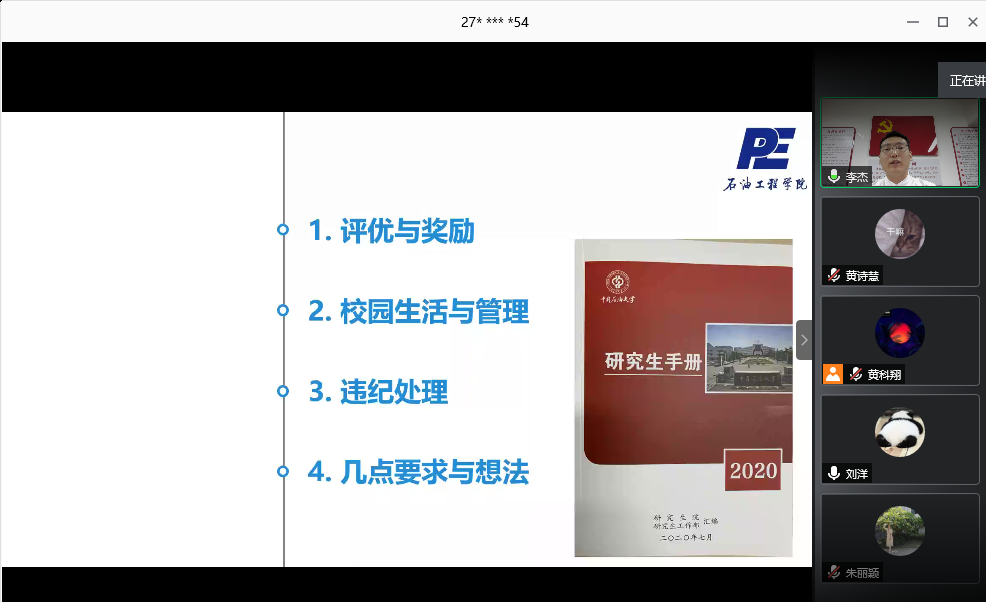 首先由2020级研究生辅导员李杰进行研究生手册的宣讲。李杰老师从评优与奖励,校园生活与管理,宿舍违纪处理方法,饮食起居等各个方面介绍了与研究生生活息息相关的事情。