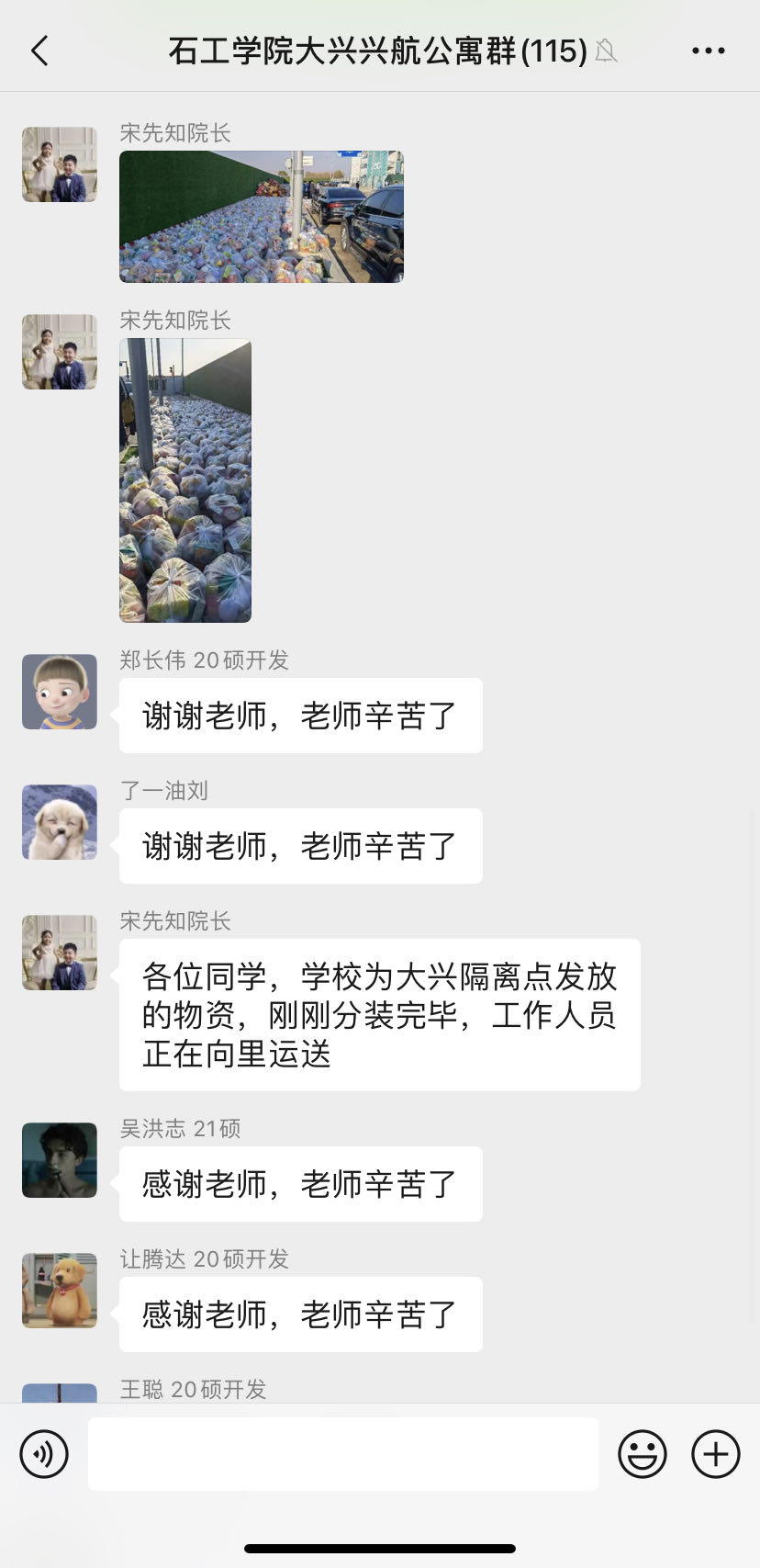 油气田开发系王建国老师主动报名,作为温德姆酒店隔离点带队老师,陪同学一起隔离。安维青、周晓峰两位老师入驻润杰公寓,门成全老师入驻东校园,协助解决学生们关切的问题。得知班里一名同学身体不适,需要复诊,石工21-3班班主任赵晓亮老师立即赶去医院,帮助学生远程就医复诊。