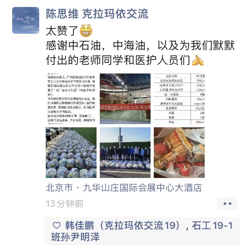 按照学校安排,学院承担了部分隔离点慰问品的发放工作。14日上午,学院教师志愿队15人在副院长王宴滨的带领下,迅速集结、快速完成了370份慰问物资的搬运、分装和运送。学院党委书记黄世军、院长宋先知与老师们一同将中国石油集团公司捐赠的大礼包运送、卸载至大兴兴航公寓。