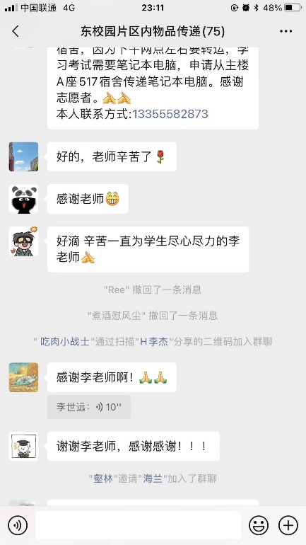 李世远老师在东校区为学生搬运的物资