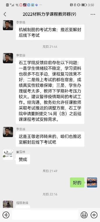 学院全体教师积极投身线上授课,开启课程回看功能,满足学生多样化上课需求,授课之前进行课程思政,引导学生坚定信心、理性乐观、共抗疫情。为了缓考学生备考压力,优化考试方案,部分课程申请课程缓考,增开线上答疑,稳定学生紧张情绪,使学生能够兼顾当前疫情防控和学业考试。