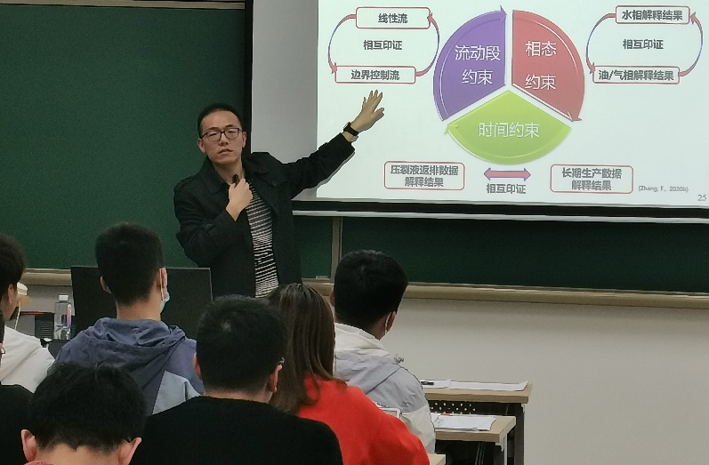 张凤远老师分享《基于多相排采数据的动态裂缝反演方法》方面的专业知识,还利用亲身经历,给同学们现身说法,分析国内与国外环境攻读博士的利弊。