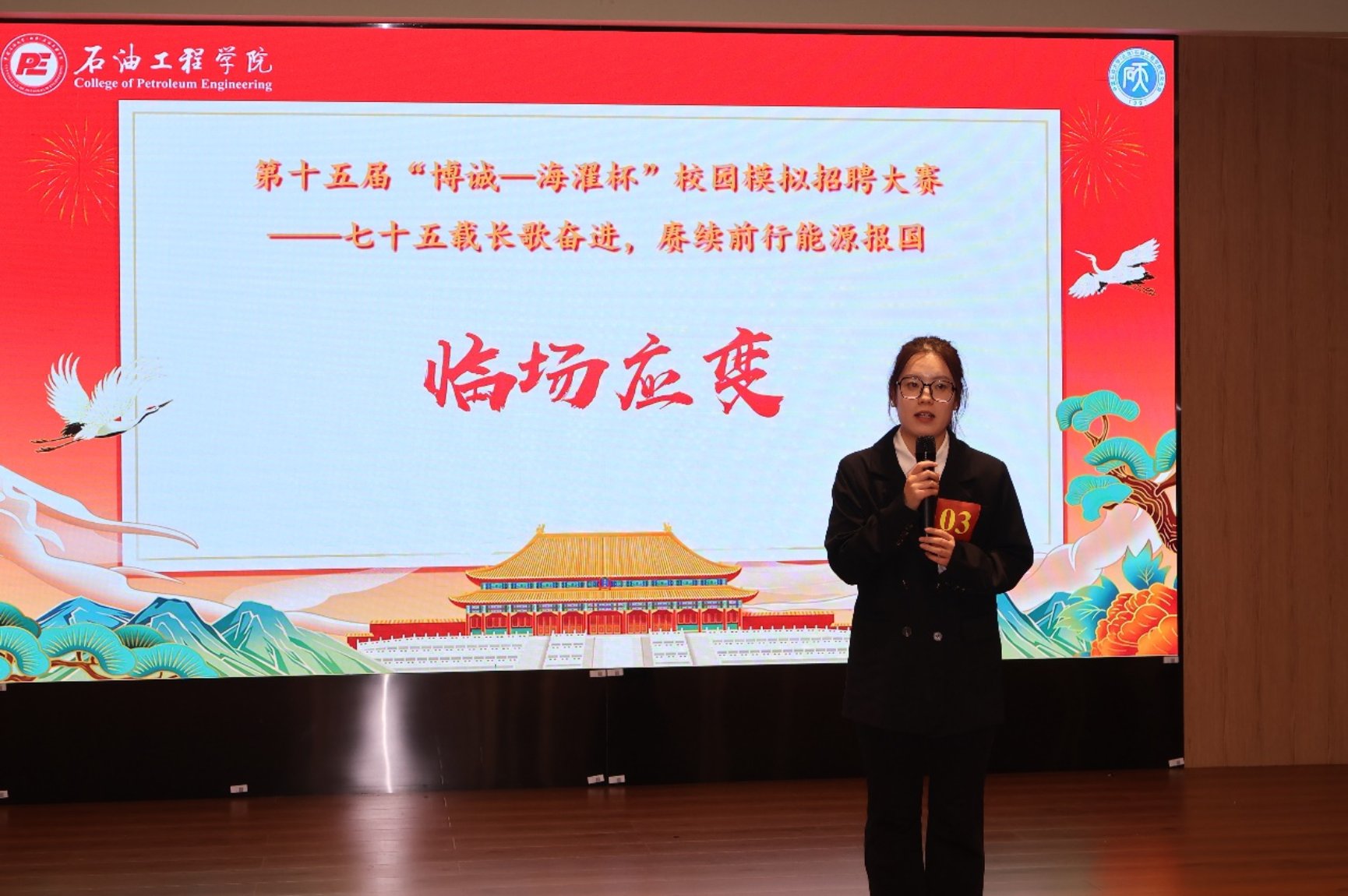 第十五届“博诚—海濯杯”校园模拟招聘大赛在掌声中落下帷幕。大赛的圆满完成标志着参赛学生求职能力的显著提升、校园职业生涯规划教学的成功实践、校企双向合作模式的纵深发展。未来,石油工程学院将不断创新工作方法和活动形式,扎实推进大学生就业指导工作,实现学生自我认知与职业规划的有机融合。