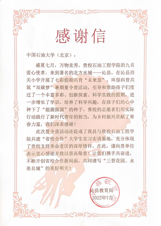近日,长治市沁县教育局向开云kaiyun官方网站发来感谢信,对开云kaiyun官方网站石油工程学院在暑期组织志愿者赴沁县西关小学开展七彩假期共育“未来苗”,环保科普共筑“双碳梦”暑期夏令营活动表示感谢。