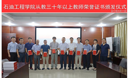 在第35个教师节来临之际,北京市教育工会为从教三十年以上教师制作了纪念奖杯。根据校工会的部署安排,石油工程学院于2019年9月11日下午,举办从教三十年教师荣誉证书和纪念奖杯颁发仪式。颁发仪式由学院工会主席刘伟主持,分党委书记宁正福、院长张广清和从教三十年以上教师代表出席活动。