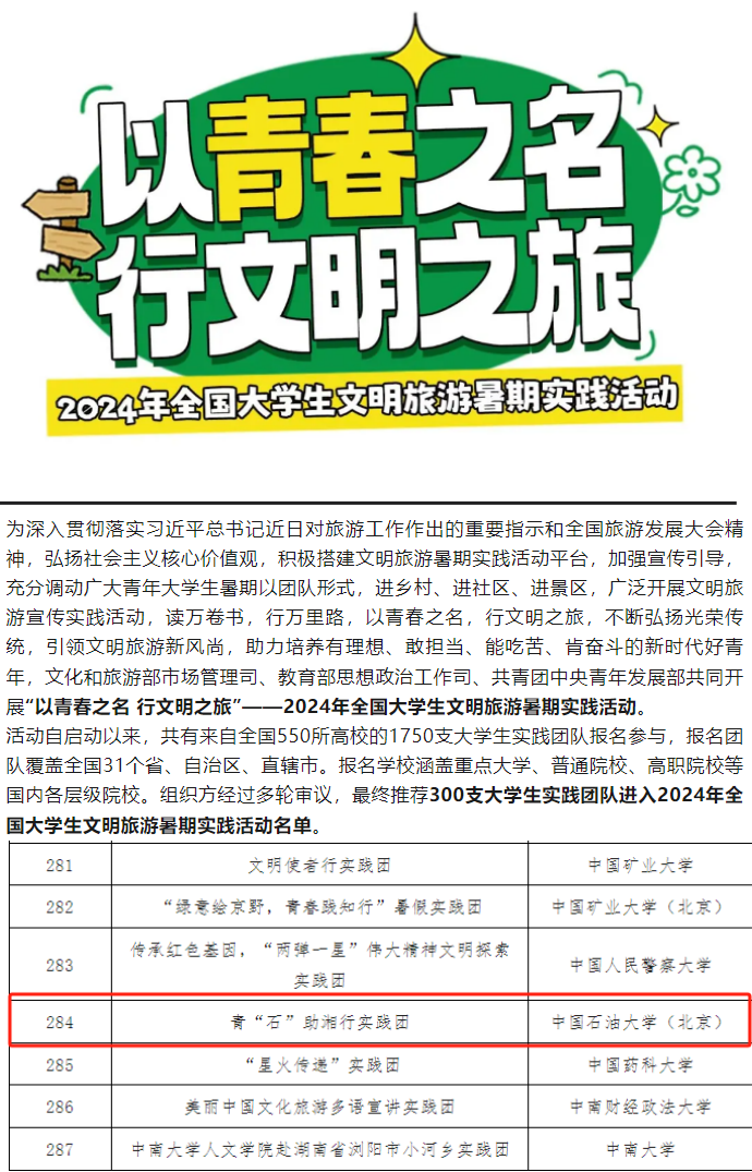 近日,由文化和旅游部市场管理司、教育部思想政治工作司、共青团中央青年发展部共同开展“以青春之名 行文明之旅”——2024年全国大学生文明旅游暑期实践活动入选名单揭晓。学院“青”石助湘行实践团成功入选。