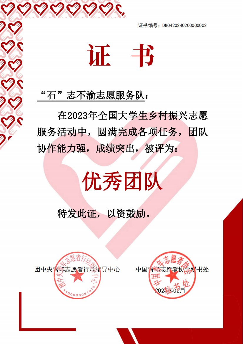 为动员引导广大青年学生服务乡村振兴战略,投身乡村振兴一线,中国农业发展银行、团中央青年志愿者行动指导中心联合开展2023年全国大学生“乡村振兴”志愿服务项目,全国共计 1000 支团队入选。通过志愿服务队提交总结材料、主办单位考核评估,最终嘉许 100 支优秀团队。