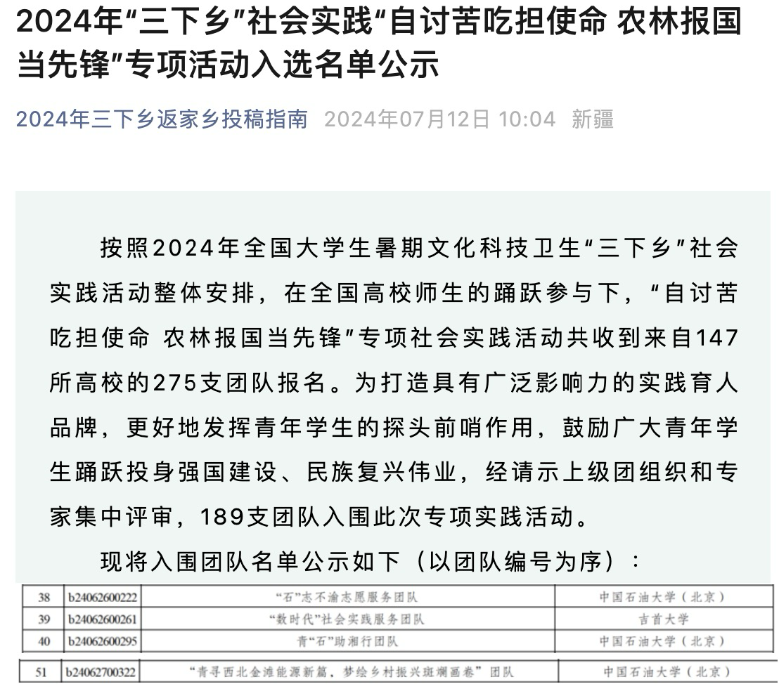 为贯彻落实习近平总书记给中国农业大学科技小院的同学们回信精神,全国农林高校共青团工作联盟开展2024年全国大学生暑期“三下乡”社会实践“自讨苦吃担使命 农林报国当先锋”专项活动,共收到来自147所高校的275支团队报名,经请示上级团组织和专家集中评审,189支团队入围此次专项实践活动。学院“石”志不渝志愿服务队、青“石”助湘行实践团、“青寻西北金滩能源新篇 梦绘乡村振兴斑斓画卷”实践团3支团队成功入选。