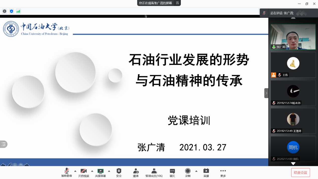 3月27日下午,石工学院院长张广清通过腾讯会议线上平台为石油工程学院100余名入党积极分子讲党课,党课题目为《石油行业发展的形势与石油精神的传承》。