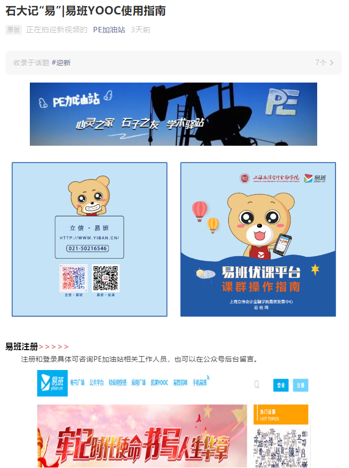 自9月1日起,石油工程学院下属学生组织和社团在易班入学教育工作中积极工作。开拓者新媒体工作室着手运营易班优课YOOC平台,通过石工学院公众号PE加油站发布推文引导新生参与易班,定性定量地将工作细化,确保每一项工作落实到位,还结合青年马克思主义学习社供稿强化思政教育学习。学生会与青年志愿者协会安排经验丰富的学长学姐引导新生学习,在线为新生答疑解惑,有效帮助新生完成对大学生活的初探,强化学生群体纽带,助推新生“线上起跑”。