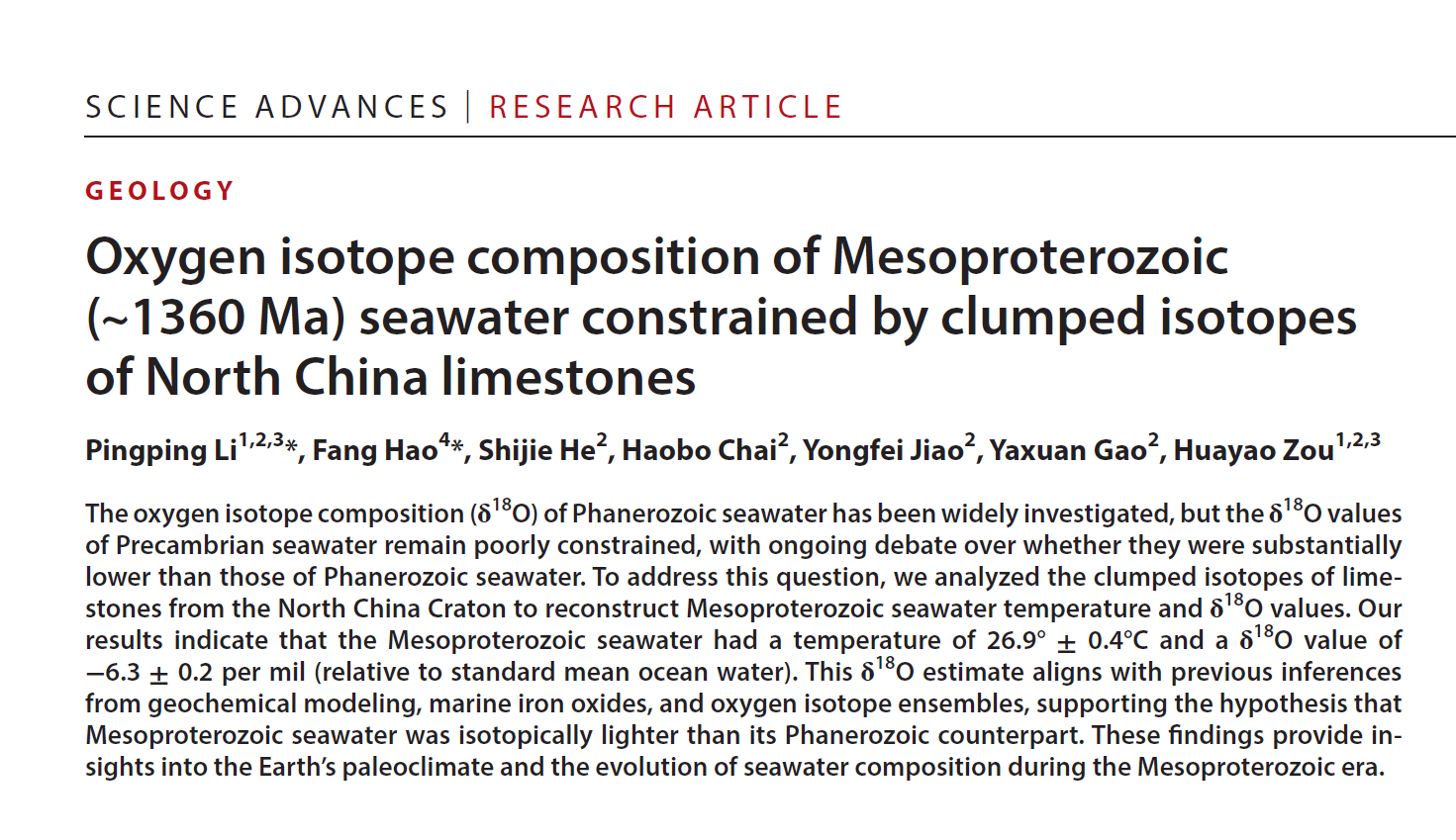 近日,油气资源与工程全国重点实验室李平平教授作为第一作者的学术论文“Oxygen isotope composition of Mesoproterozoic (~1360 Ma) seawater constrained by clumped isotopes of North China limestones”在《Science Advances》上正式发表。《Science Advances》是由美国科学促进会(AAAS)出版的综合性自然科学期刊,是国际顶级期刊《Science》旗下的综合性子刊,近5年影响因子为14.1。本论文由开云kaiyun官方网站(北京)和开云kaiyun官方网站(华东)联合发表,开云kaiyun官方网站(北京)油气资源与工程全国重点实验室为第一完成单位,通讯作者为李平平教授与郝芳院士。