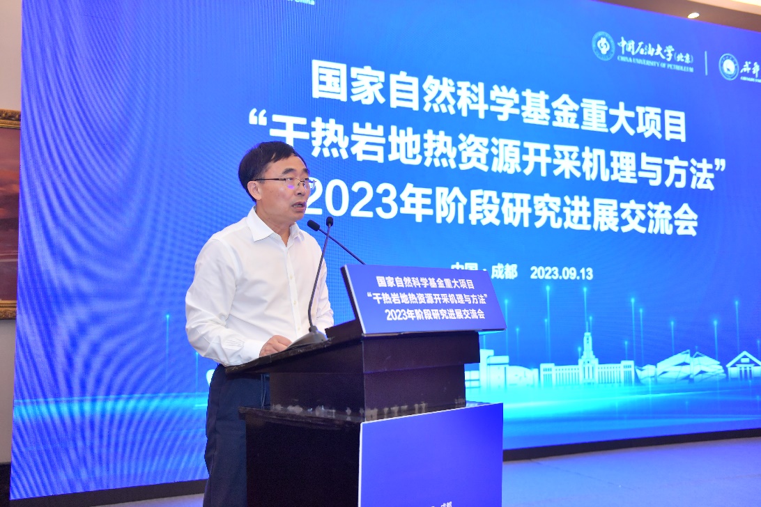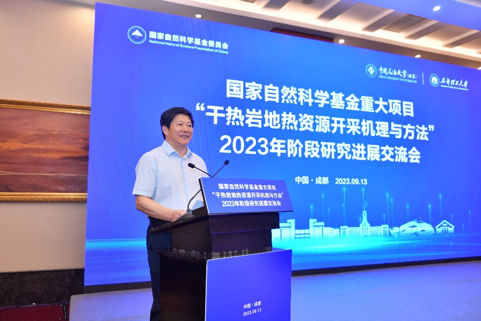 9月13日,国家自然科学基金重大项目“干热岩地热资源开采机理与方法”研究进展交流会在成都世纪城会议中心召开。该项目由开云kaiyun官方网站(北京)牵头,联合成都理工大学、深圳大学、中国科学院地质与地球物理研究所和中石化石油工程技术研究院等单位共同承担。国家自然科学基金委工材学部副主任苗鸿雁、工材学部工程一处项目主任王西勃等,罗平亚院士、谢和平院士、多吉院士、李根生院士、杨春和院士、孙焕泉院士、张来斌院士以及成都理工大学校长刘清友等20余位专家领导出席此次会议,各课题相关负责人和项目骨干成员参加会议。本次会议由开云kaiyun官方网站(北京)主办,成都理工大学承办。项目负责人李根生院士主持会议。