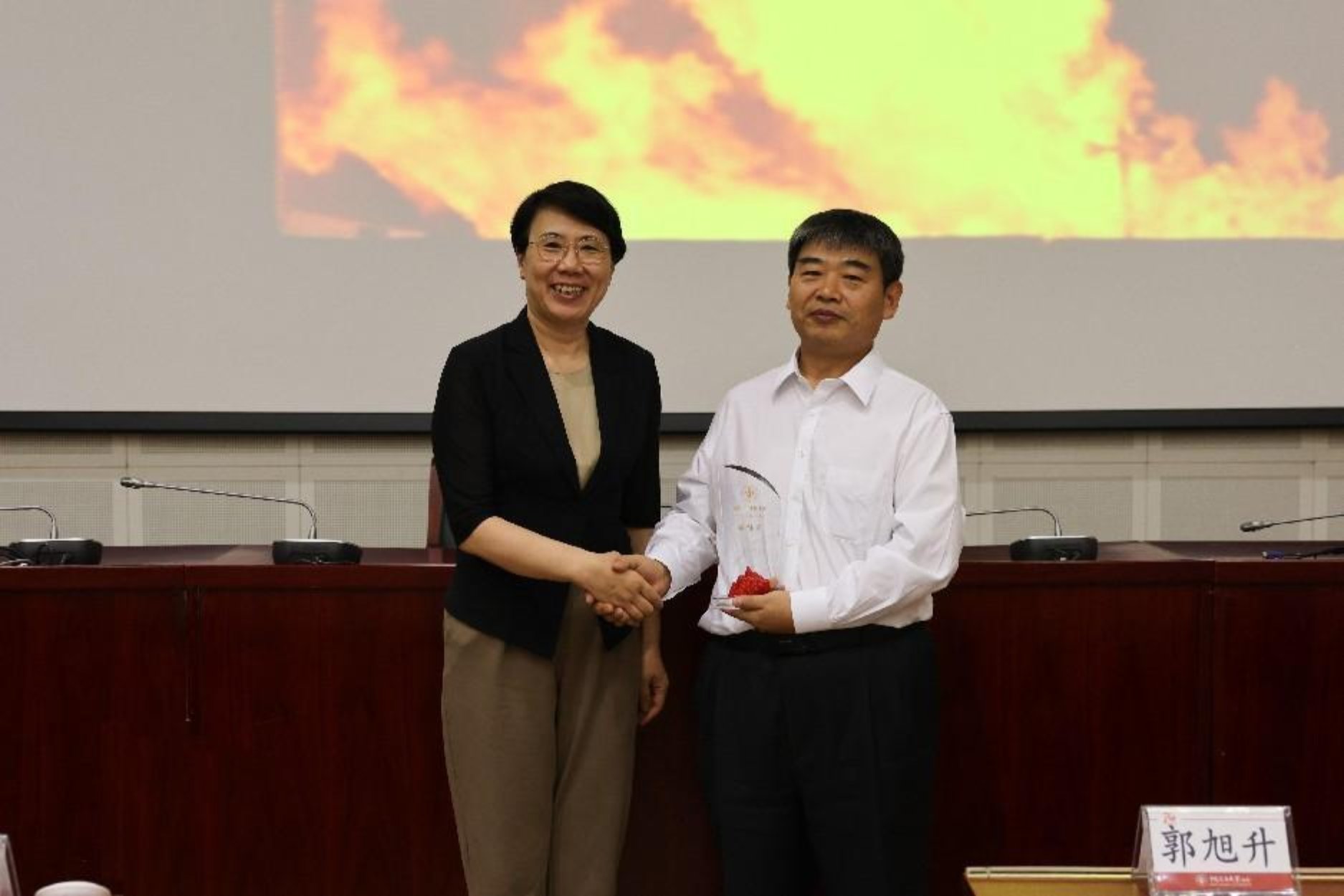 吴小林为郭旭升院士颁发了“蟒山讲坛”纪念牌。