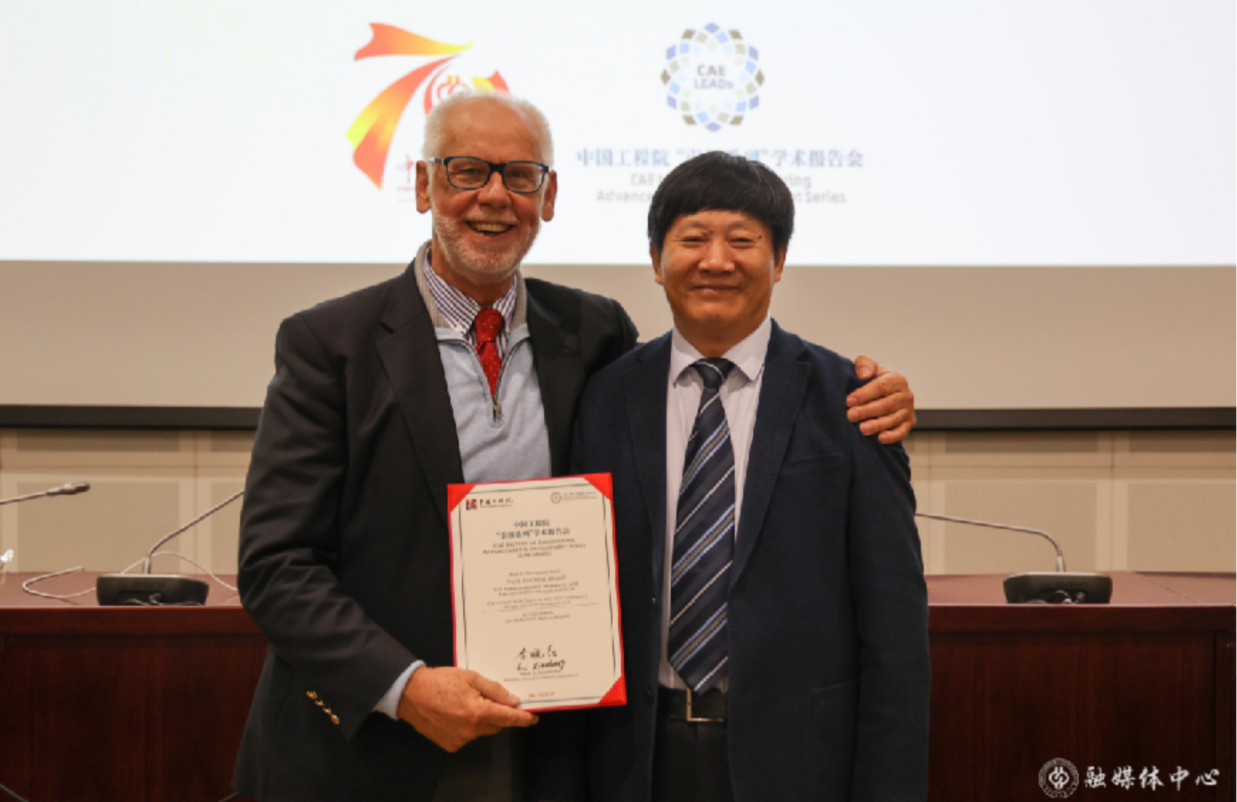 随后,李根生院士为Michael Hood院士颁发中国工程院“引领系列”学术报告会证书,并合影留念。