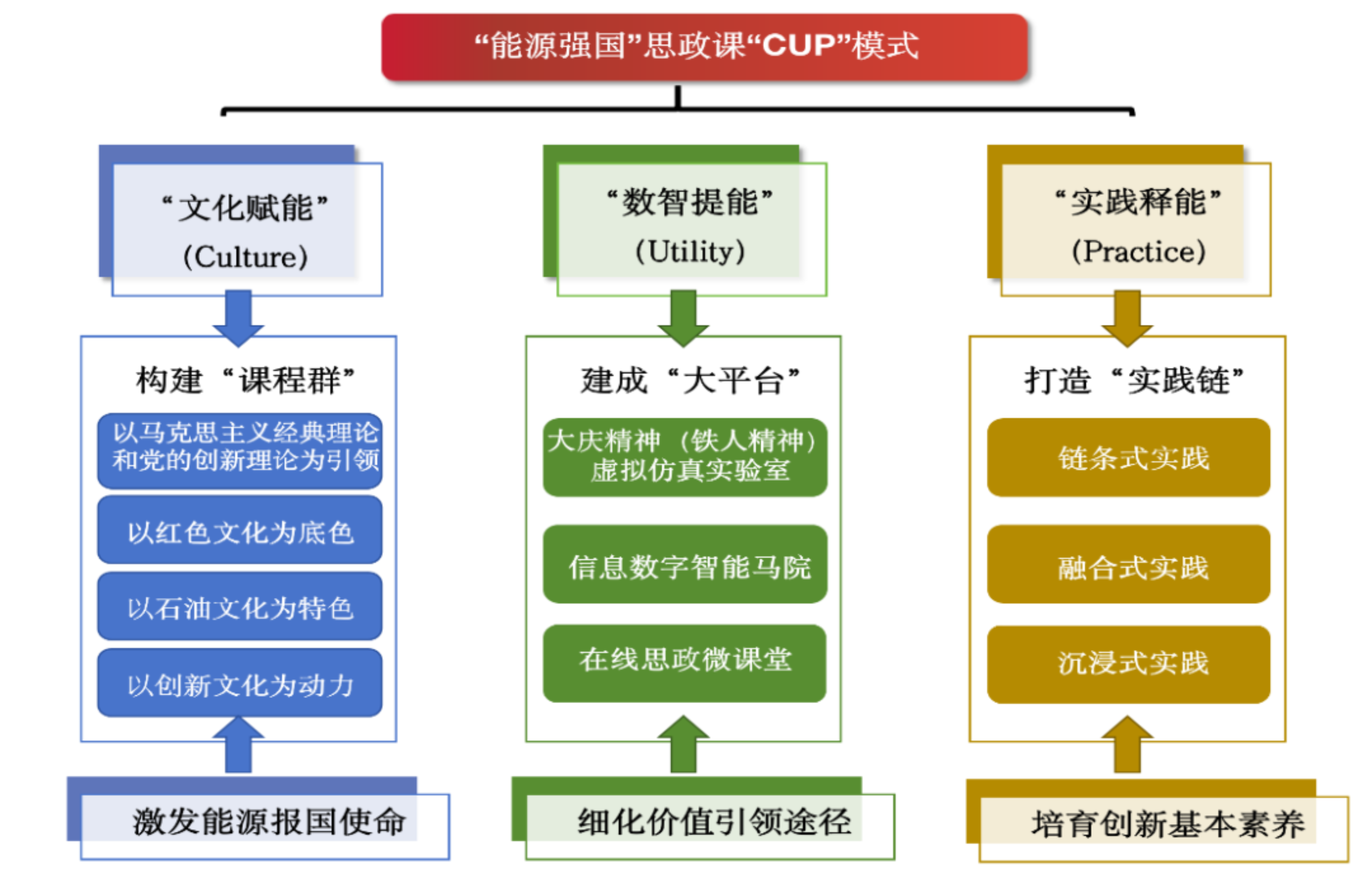 党委立足实际和办学特色,建构了以“文化赋能”为精神底色,“数智提能”为引领途径,“实践释能”为成效支撑的“能源强国”大思政课“CUP”育人体系。