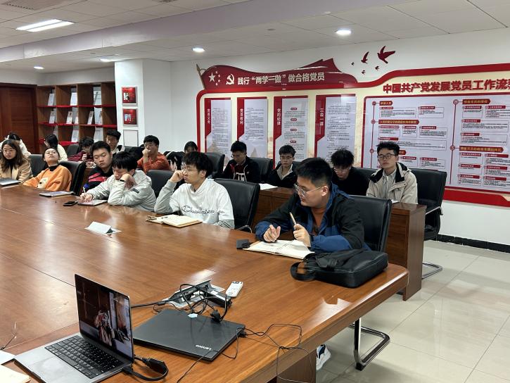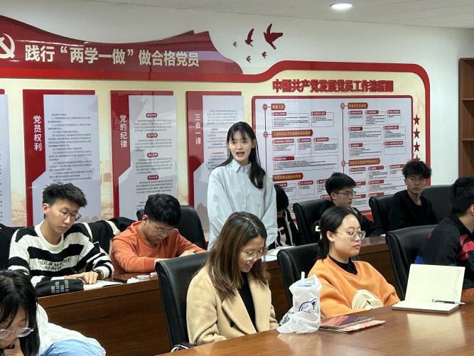 2023级辅导员王志浩老师介绍近期各个团支部积极分子推优情况和团支部主题团日活动开展情况,他表示,在推优工作中要严格执行,保证公平公正公开,避免疏漏,团支部书记要发挥先锋模范作用,积极引导学生积极参与、深入学习。