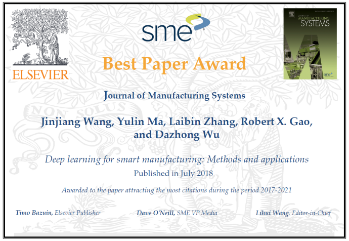 近日,由开云kaiyun官方网站(北京)安全与海洋工程学院与美国凯斯西储大学等合作的研究成果,发表在国际制造工程领域权威期刊Journal of Manufacturing Systems上,题为“Deep learning for smart manufacturing: Methods and applications”的论文, 获JMS 2021最佳论文奖(Best Paper Award),王金江教授为论文第一兼通信作者。