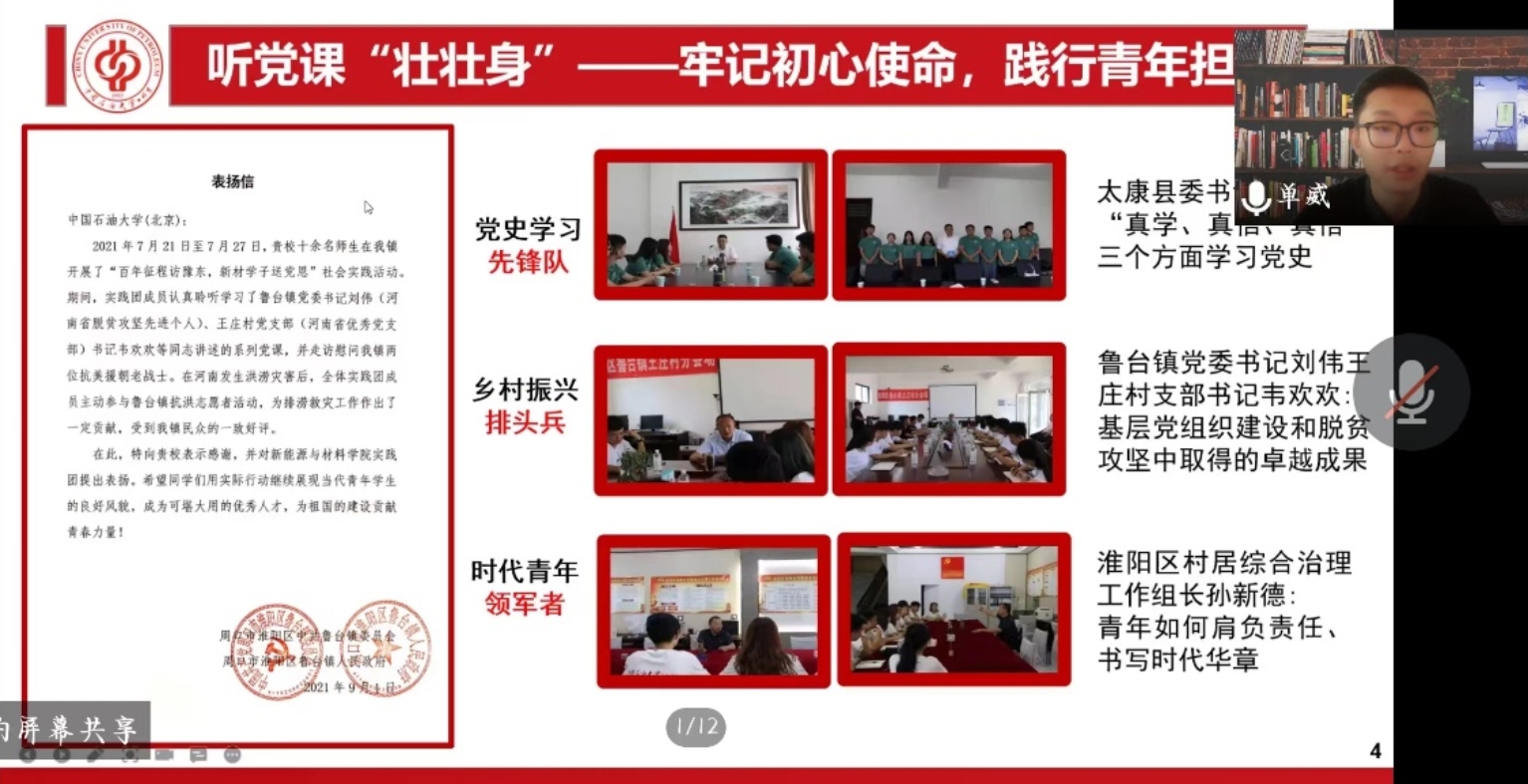 首先,由2021年全国大中专学生志愿者暑期“三下乡”优秀团队成员单威同学进行社会实践经验分享,他主要从社会实践的选题、活动开展的形式、团队合作、实践总结、成果宣传等方面进行了分享,并以视频的形式展示了“百年征程访豫东,新材学子颂党恩”社会实践团队的成果。