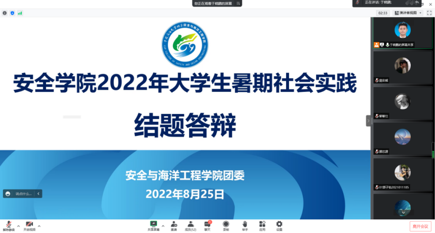 进一步检验2022年暑期社会实践成果,深入总结经验,强化广大学子使命担当,提升实践能力素质, 8月25,安全学院通过线上腾讯会议的形式成功举办2022年暑期社会实践结题答辩安全学院团委书记方百会,辅导员付强、马明雨、赵思源出席会议并担任评委,共计37支队伍参与了此次答辩,会议由辅导员于晓鹏主持。